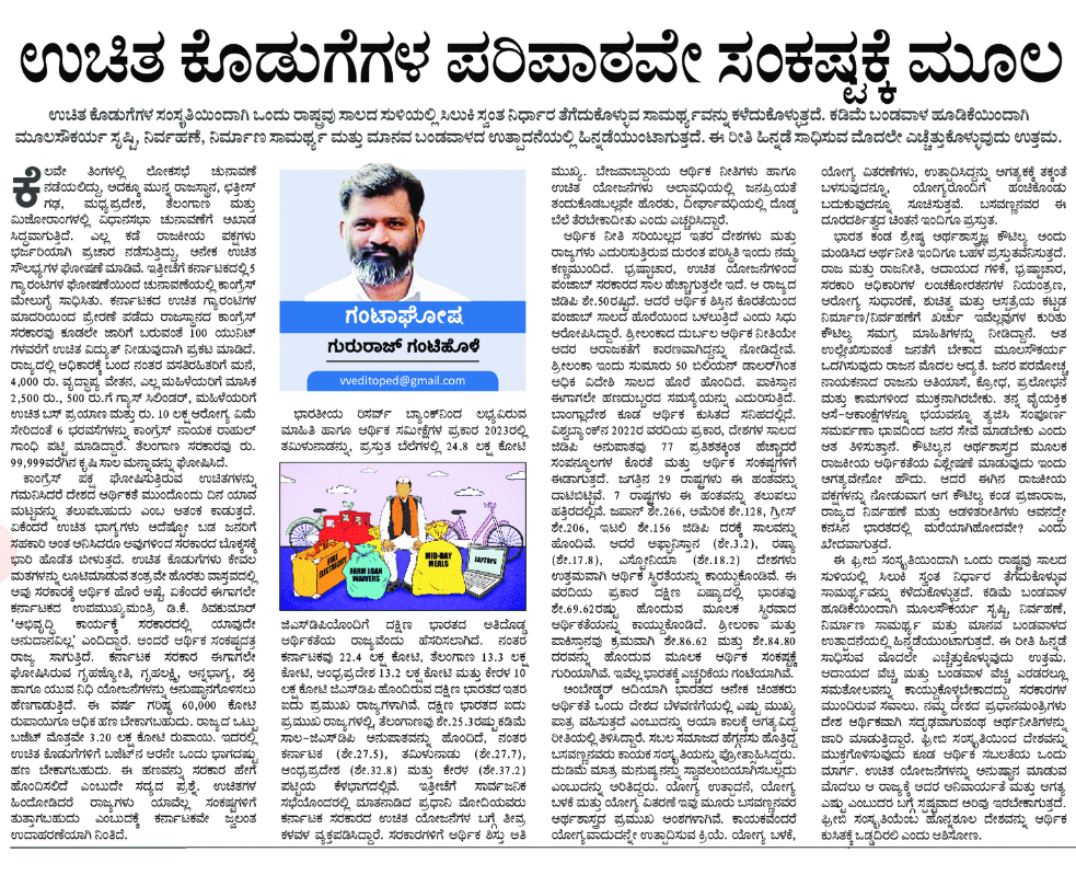 ಅಂದರೆ ಆರ್ಥಿಕ ಸಂಕಷ್ಟದತ್ತ ರಾಜ್ಯ ಸಾಗುತ್ತಿದೆ. ಕರ್ನಾಟಕ ಸರಕಾರ ಈಗಾಗಲೇ ಘೋಷಿಸಿರುವ ಗೃಹದ್ಯೋತಿ, ಗೃಹಲಕ್ಷ್ಮಿ, ಅನ್ನಭಾಗ್ಯ, ಶಕ್ತಿ ಹಾಗೂ ಯುವ ನಿಧಿ ಯೋಜನೆಗಳನ್ನು ಅನುಷ್ಠಾನಗೊಳಿಸಲು ಹೆಣಗಾಡುತ್ತಿದೆ. ಈ ವರ್ಷ ಗರಿಷ್ಠ ೬೦,೦೦೦ ಕೋಟಿ ರುಪಾಯಿಗೂ ಅಧಿಕ ಹಣ ಬೇಕಾಗಬಹುದು. ರಾಜ್ಯದ ಒಟ್ಟು ಬಜೆಟ್ ಮೊದೇ ೩೨೦ ಲಕ್ಷ ಕೋಟಿ ರುಪಾಯಿ, ಇದರಲ್ಲಿ ಉಚಿತ ಕೊಡುಗೆಗಳಿಗೆ ಬಜೆಟ್‌ನ ಆರನೇ ಒಂದು ಭಾಗದಷ್ಟು ಹಣ ಬೇಕಾಗಬಹುದು. ಈ ಹಣವನ್ನು ಸರಕಾರ ಹೇಗೆ ಹೊಂದಿನ ಲಿದೆ ಎಂಬುದೇ ಸದ್ಯದ ಪ್ರಶ್ನೆ, ಉಚಿತಗಳ ಹಿಂದೋಡಿದರೆ ರಾಜ್ಯಗಳು ಯಾವಲ್ಲ ಸಂಕಷ್ಟಗಳಿಗೆ ತುತ್ತಾಗಬಹುದು ಎಂಬುದಕ್ಕೆ ಕರ್ನಾಟಕವೇ ಜ್ವಲಂತ ಉದಾಹರಣೆಯಾಗಿ ನಿಂತಿದೆ.